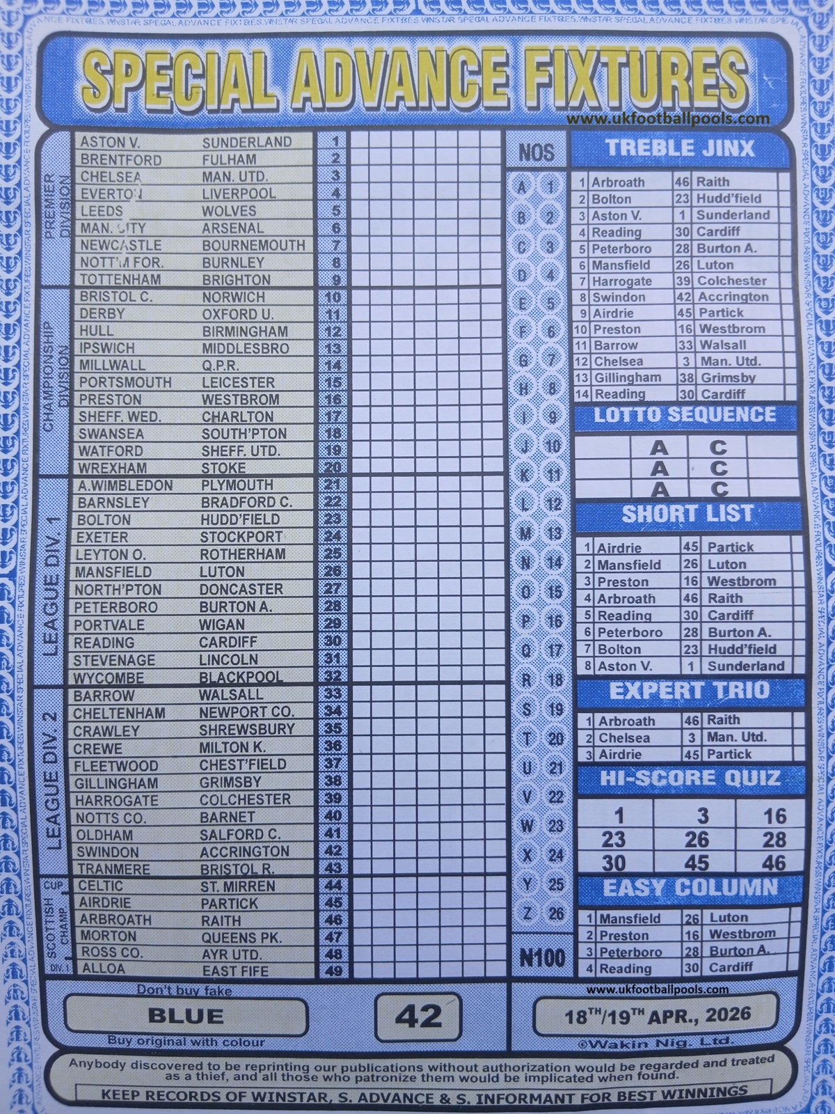 SPECIAL ADVANCE AND RIGHT ON FOOTBALL FIXTURES